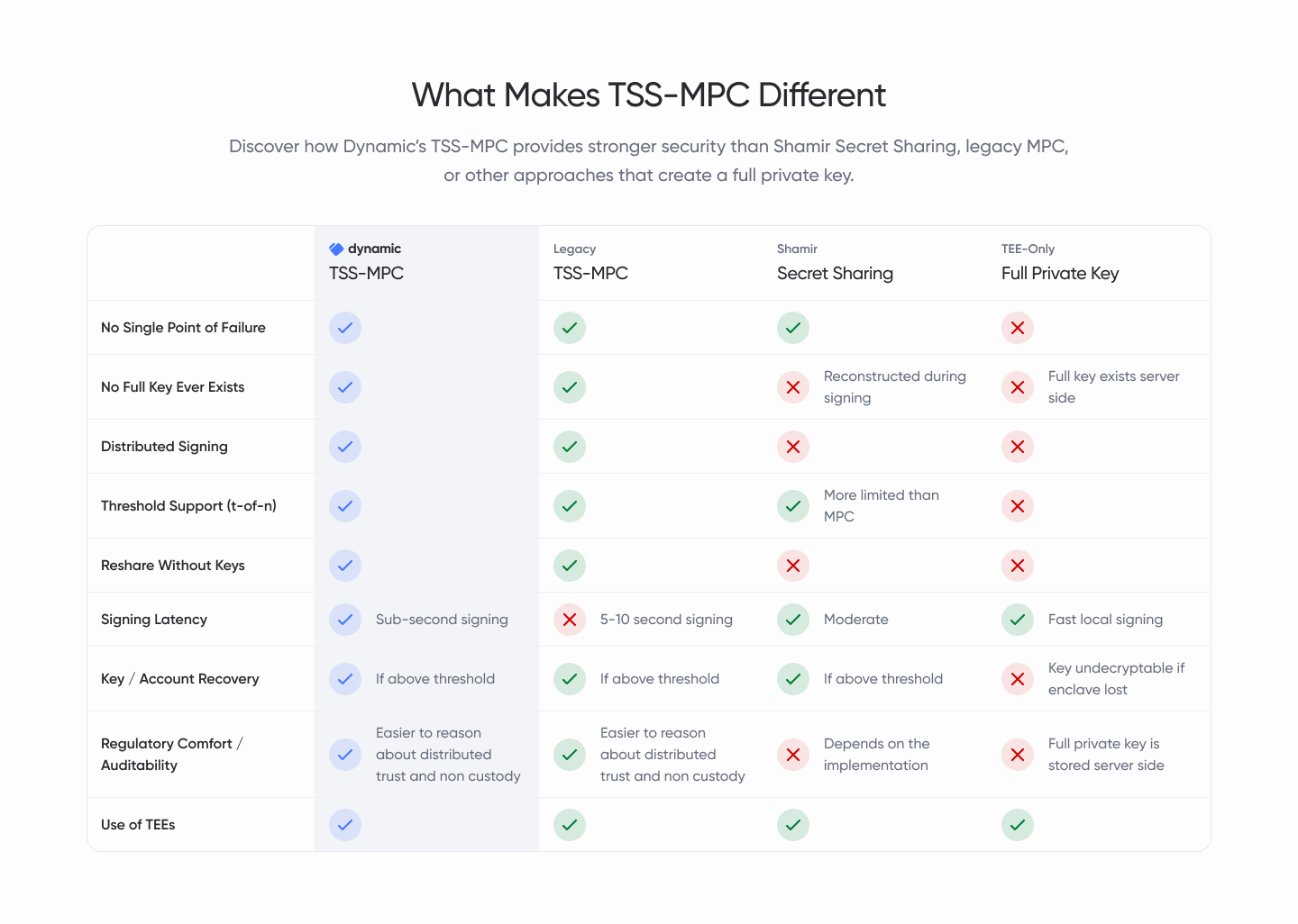 Dynamic uses a threshold-based MPC scheme that continually refreshes key shares and enables secure recovery. It delivers the resilience and verifiability required by regulated institutions while maintaining the performance expected by modern applications.