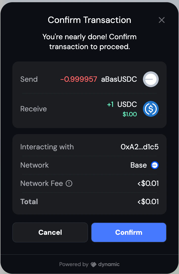 Dynamic’s embedded wallets include built-in transaction previews. To enable, go to Developer Settings → Embedded Wallets → Dynamic in the dashboard and toggle on Show Confirmation UI and Transaction Simulation. Users will see a breakdown of assets transferred, estimated fees, and the contract address before confirming any Aave transaction.