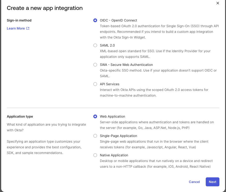 • “OIDC - OpenID Connect” and “Web Application” and click “Next”