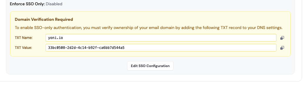 After saving the record you will be prompted to complete the domain verification to enforce all emails from your domain to login with Okta