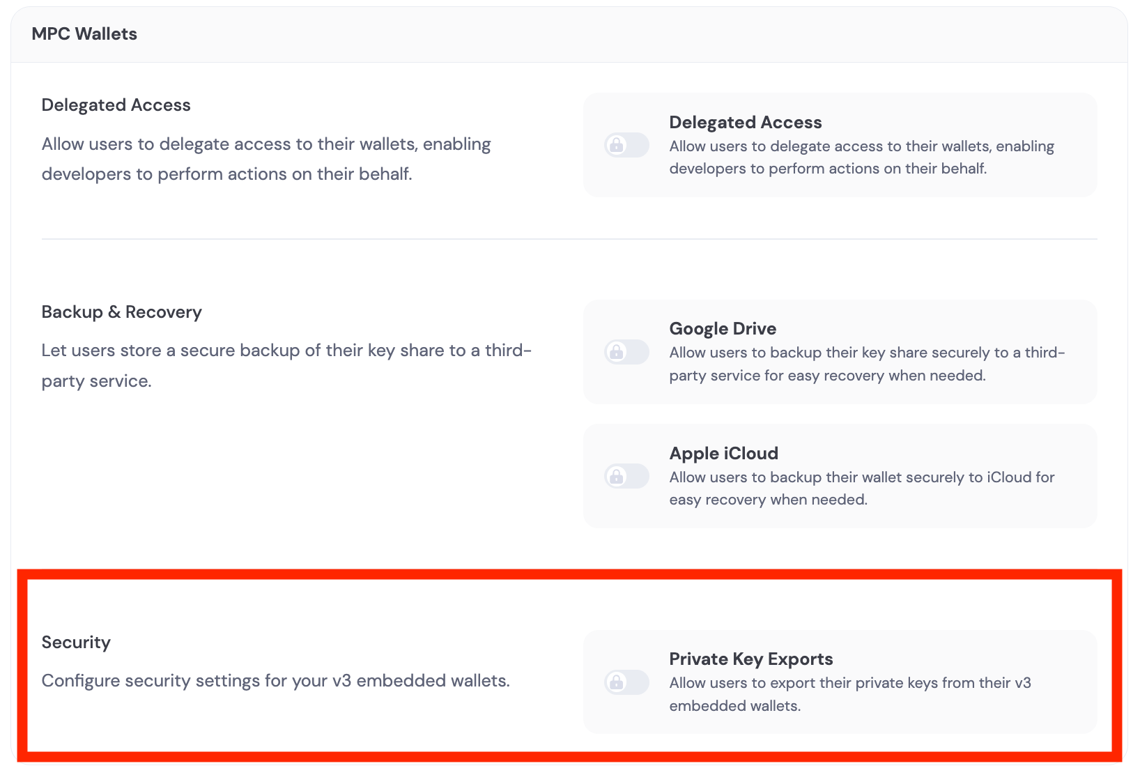 You can disable private key exports for your users via the dashboard. Navigate to Embedded Wallets > MPC Wallets and find the Security section. Toggle off Private Key Exports to prevent users from exporting their private keys.This feature requires the latest SDK version. Make sure to update your SDK before enabling this setting.